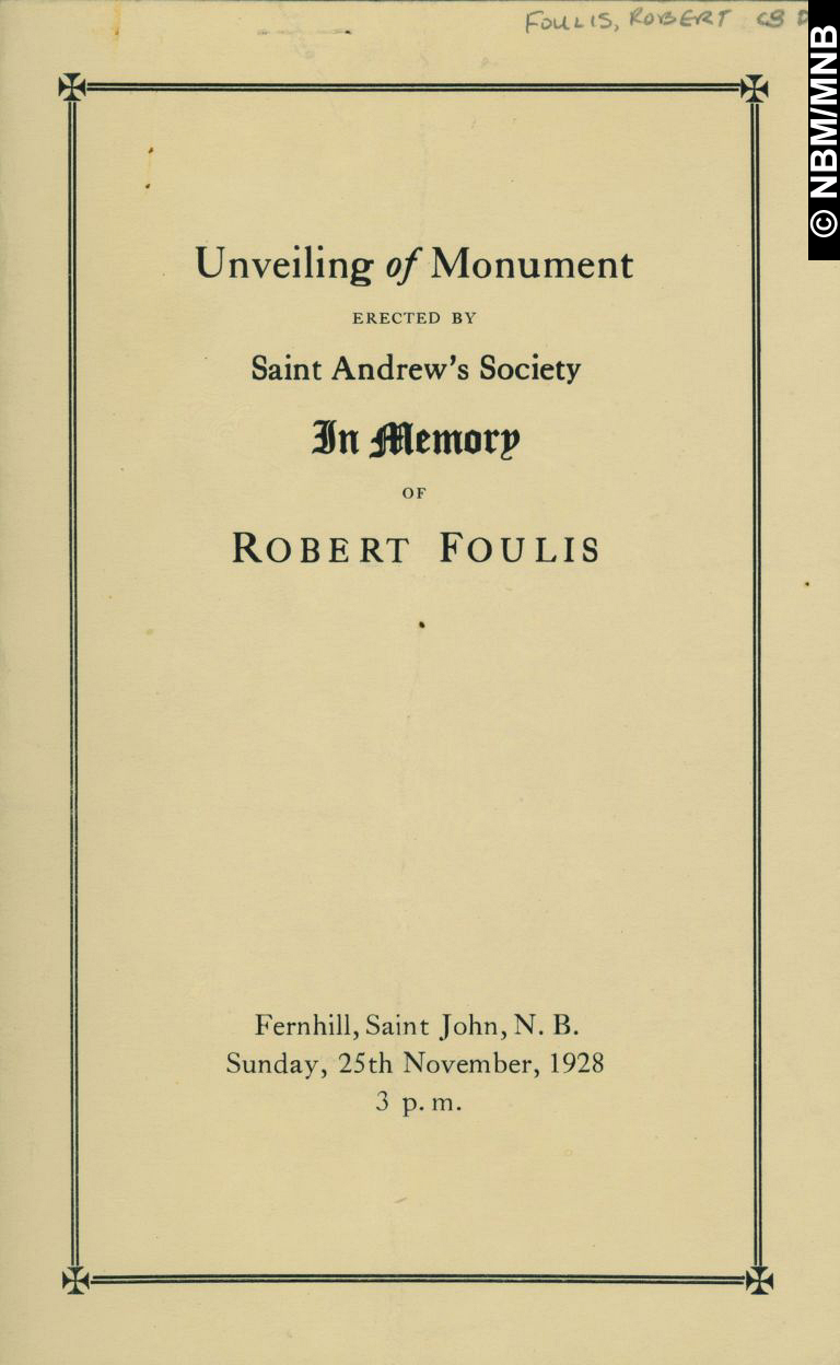 | Title: Unveiling of Monument erected by Saint Andrew's Society in Memory of Robert Foulis, Fernhill, Saint John, N.B. | |||