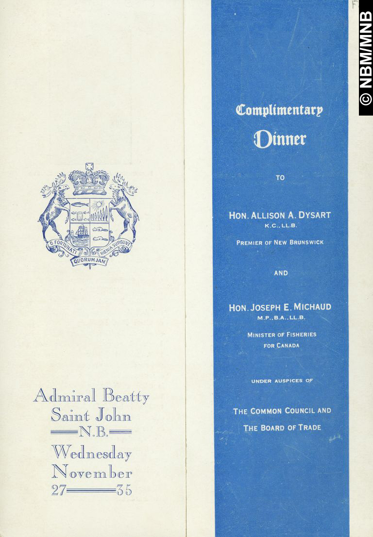 | Title: Complimentary Dinner to Hon. Allison A. Dysart and Hon. Joseph E. Michaud, under the Auspices of the Common Council & the Board of Trade, Admiral Beatty, Saint John, N.B. | |||