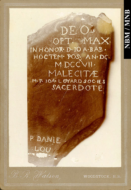 photograph: Dedication Stone of the Aboriginal Church Built at Meductic, New Brunswick, c. 1900 Canadian silver print mounted on card 15 x 10.5 cm Gift of Dr. William Francis Ganong, 1942 New Brunswick Museum, (1987.17.1393) Return |