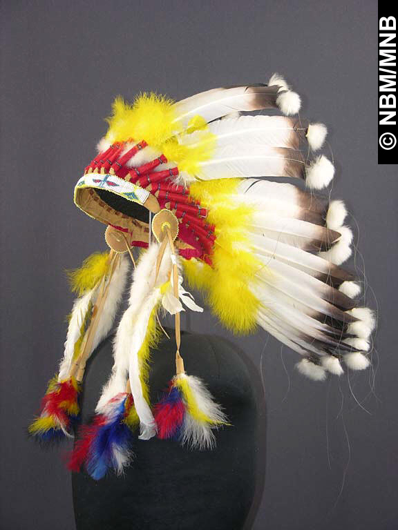 headdress: 1979 First Nations; Wolastoqiyik deerskin, glass beads, eagle feathers ? and fur 84 x 55 x 59 cm Neqotkuk (Tobique First Nation) Gift of Father Norman Thibodeau, 1992 New Brunswick Museum, (1992.16.5) Photographed by W. Mark Polchies Return |