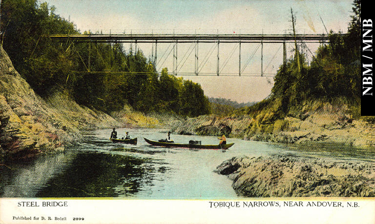 carte postale : Pont de fer, Tobique Narrows, près d'Andover, Nouveau-Brunswick, v. 1910 canadienne typographie simili en couleur sur carton 8,5 x 14 cm Collection William Francis Ganong Musée du Nouveau-Brunswick, (1987.17.330) retournez |