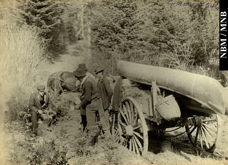 photographie : En plein repas sur la route de portage entre Saint-Léonard et l'embouchure de la rivière Wagan, Nouveau-Brunswick , v. 1900 canadienne épreuve mate au collodion 15,1 x 11,3 cm Collection William Francis Ganong Musée du Nouveau-Brunswick, (1987.17.834) retournez |