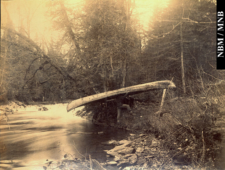 photographie : Guide wolastoqiyik portant un canot près de la rivière Green, Nouveau-Brunswick, v. 1888 canadienne épreuve à l'albumine sur carton 18,2 x 24 cm Don de William Francis Ganong, 1942 Musée du Nouveau-Brunswick, (1987.17.1379) retournez |