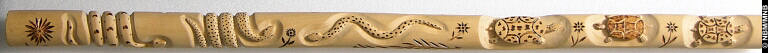bâton d’orateur : v. 1977 Premières Nations; Wolastoqiyik peuplier sculpté et pyrogravé 87,0 cm Neqotkuk (Première Nation de Tobique) Collection d'artisanat du Nouveau-Brunswick, 1995 Musée du Nouveau-Brunswick, (1995.27.177.1) retournez |
