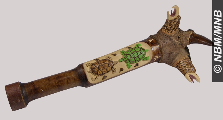 massue de guerre : v. 1977 Premières Nations; Wolastoqiyik peuplier sculpté et peint 22 cm Neqotkuk (Première Nation de Tobique) Collection d'artisanat du Nouveau-Brunswick, 1995 Musée du Nouveau-Brunswick, (1995.27.177.2) retournez |