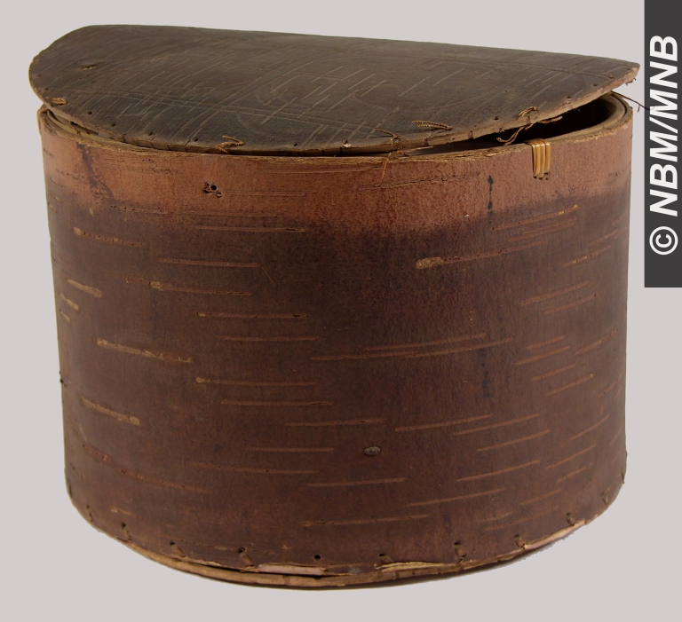 boîte : v. 1850 Premières Nations; Wolastoqiyik écorce de bouleau incisée avec racine d’épinette 16 x 23 cm Don de Evelyn Peters Musée du Nouveau-Brunswick, (3566) retournez |