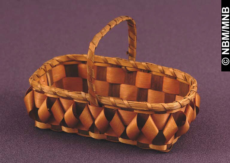 panier : v. 1880 Premières Nations; Wolastoqiyik? motif de losanges éclisses de frêne teintes et tressées avec foin d’odeur 10 x 13,5 x 9 cm Don de Charles F. Kimball, 1908 Musée du Nouveau-Brunswick, (5148) Photographie de W. Mark Polchies retournez |