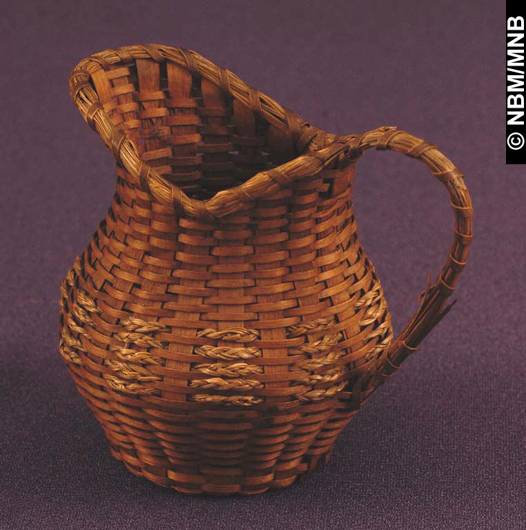 cruche : 1875-1900 Premières Nations; Mi’kmaq ou Wolastoqiyik ? éclisses de frêne teintes et tressées avec foin d'odeur tressé 11 x 12 cm Don de L. Lingley, 1909 Musée du Nouveau-Brunswick, (5213.2) Photographie de W. Mark Polchies retournez |