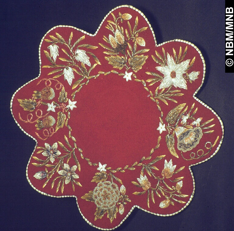 dessous-de-plat : v. 1880 Premières Nations; Mi’kmaq ou Wolastoqiyik ? laine et coton avec broderie de poil d'orignal sur écorce de bouleau 23,5 x 23,5 cm Don d’Alice Delacour Jack, Frances Allen Jack, Emma Carleton Kenah Jack et Helen Ramsay Jack, 1911 Musée du Nouveau-Brunswick, (5404.11) Photographie de W. Mark Polchies retournez |