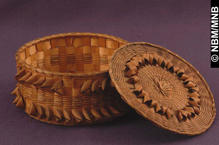 panier : v. 1900 Premières Nations; Wolastoqiyik motif de losanges; motif de chardon (variation) ? éclisses de frêne tressées avec foin d’odeur 10 x 19 x 19 cm Don de Grace W. Leavitt, 1929 Musée du Nouveau-Brunswick, (13458) Photographie de W. Mark Polchies retournez |