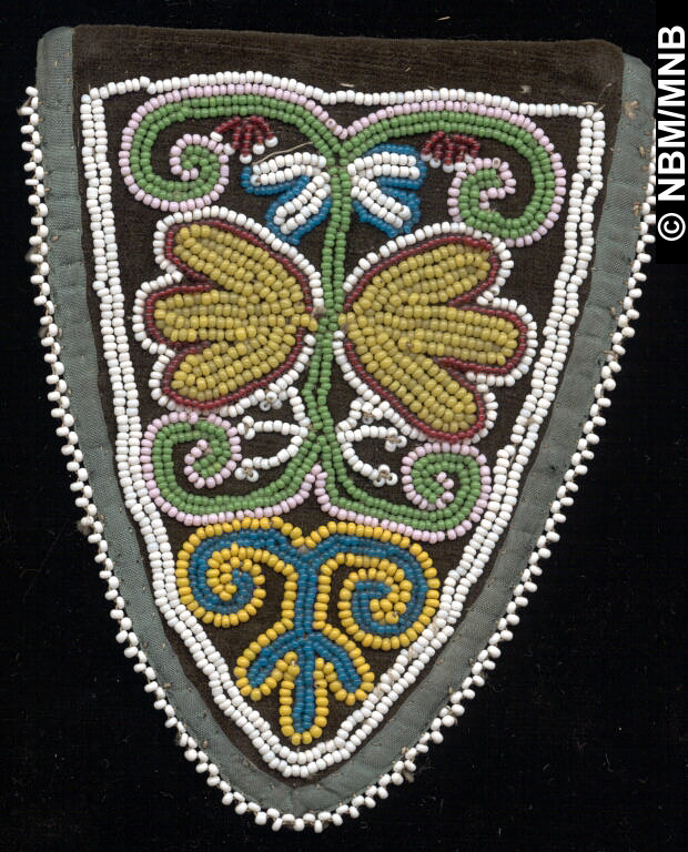 empeigne de mocassin : v. 1825 Premières Nations; Wolastoqiyik? laine, soie et coton avec perles de verre 10,2 x 8,2 cm Don de la succession d'Ida Marguerite McAvity, 1931 Musée du Nouveau-Brunswick, (15804.4) retournez |