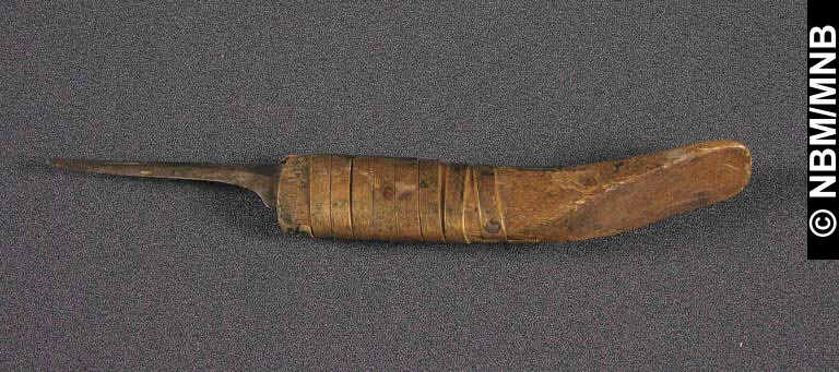 couteau : v. 1900 Premières Nations; Wolastoqiyik bois avec acier 3 x 20 cm Pilick (Première Nation de Kingsclear) Don du Chef William Polchies, 1932 Musée du Nouveau-Brunswick, (16058) retournez |