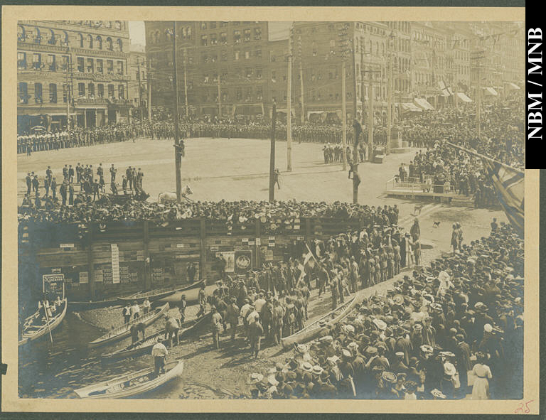 photographie : Fêtes du tricentenaire De Monts-Champlain - Arrivée de navire, Market Square, Saint John, Nouveau-Brunswick, 24 juin 1904
