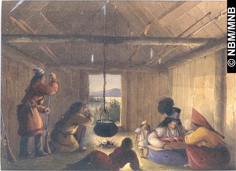tableau : Intérieur d'une cabane en bois des Malécites - fleuve Saint-Jean, v. 1840 canadienne aquarelle, avec mine de plomb sur papier vélin, collé en plein sur carton rigide 21,3 x 30,8 cm Collection John Clarence Webster Canadiana Musée du Nouveau-Brunswick, (W5943) retournez |