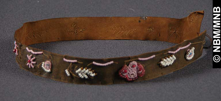 bandeau : v. 1900 Premières Nations; Mi’kmaq ou Wolastoqiyik ? cuir avec perles de verre 2,5 x 26 cm Collection Musée du Nouveau-Brunswick Musée du Nouveau-Brunswick, (X251) Photographie de W. Mark Polchies retournez |