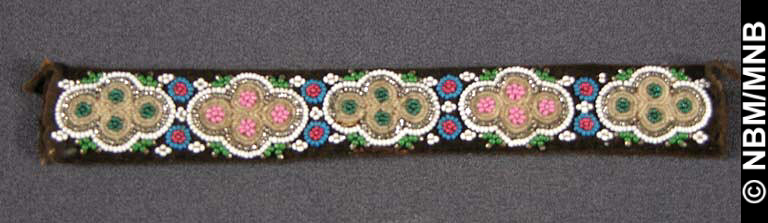 bracelet : 1875-1900 Premières Nations; Wolastoqiyik soie avec perles de verre 3 x 19,5 cm Collection Musée du Nouveau-Brunswick Musée du Nouveau-Brunswick, (X326.6) retournez |