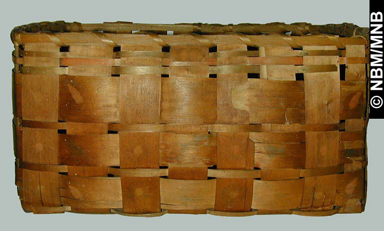 panier : 1825-1850 Premières Nations; Mi’kmaq ou Wolastoqiyik ? éclisses de frêne teintes et tressées avec motif estampé 24 x 29 x 44 cm Collection Musée du Nouveau-Brunswick Musée du Nouveau-Brunswick, (X4509) retournez |