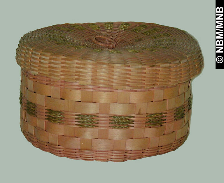 panier : 1875-1925 Premières Nations; Wolastoqiyik? éclisses de frêne teintes et tressées avec foin d'odeur tressé 10 x 16,5 x 16,5 cm Collection Musée du Nouveau-Brunswick Musée du Nouveau-Brunswick, (X6192) retournez |