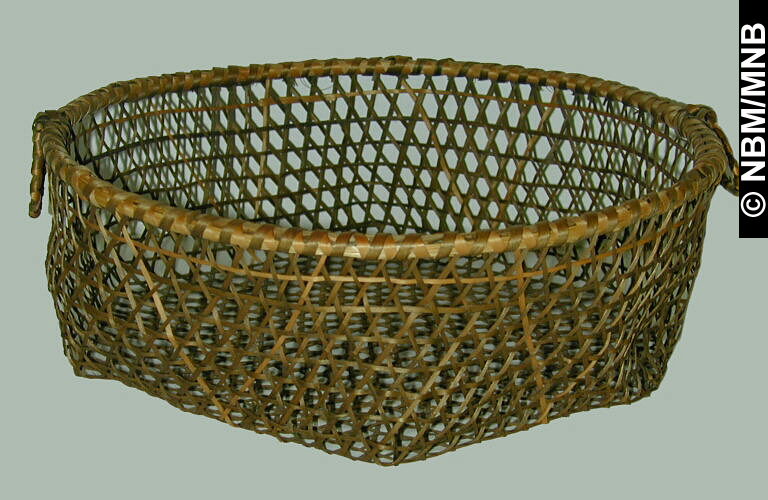 panier : 1875-1900 Premières Nations; Wolastoqiyik? motif de treillis de raquette éclisses de frêne teintes et tressées avec bois 9 x 24,5 x 24,5 cm Collection Musée du Nouveau-Brunswick Musée du Nouveau-Brunswick, (X6197) retournez |