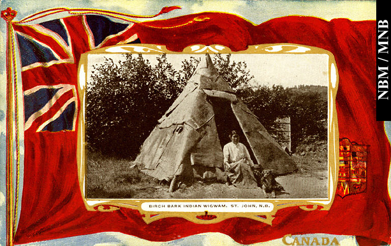 carte postale : Annie Sacobie à l'entrée d'un wigwam en écorce de bouleau, Evandale, Nouveau-Brunswick ?, v. 1910