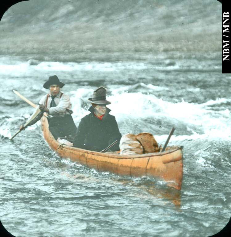 diapositive : Canot d'écorce dans le rapides Tom Ferguson, rivière restigouche, Nouveau-Brunswick, v. 1900