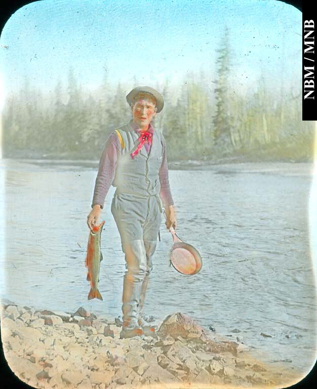 diapositive : Nicholas Lolar, guide wolastoqiyik, tenant un grilse, rivière Restigouche, Nouveau-Brunswick, v. 1900
