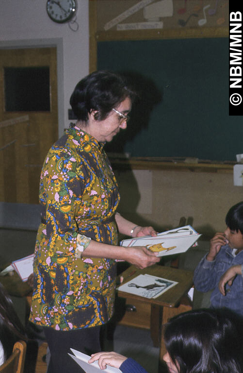 diapositive : Veronica Atwin enseignant la langue à l'école, Pilick (Première Nation de Kingsclear), Nouveau-Brunswick, mai 1976