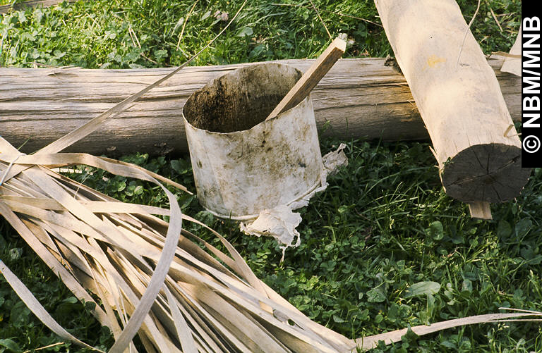 diapositive : On enduit le billot de frêne noir de boue pour révéler chaque couche , juin 1976