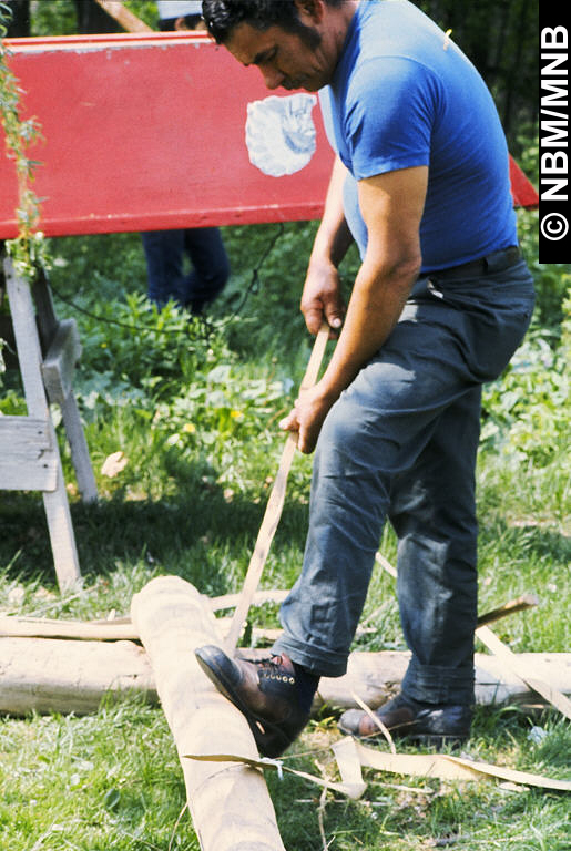 diapositive : James Atwin retire les éclisses grossières d'un frêne noir, juin 1976