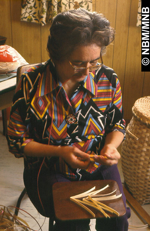 diapositive : Veronica Atwin plie les éclisses de frêne en deux pour en faire un panier , avril 1976