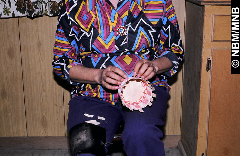 diapositive : Veronica Atwin se sert de ses ongles pour compacter le tressage et faire en sorte que le motif soit assez serré, avril 1976