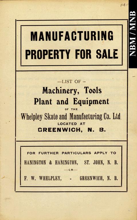 Manufacturing Property for Sale, Machinery, Tools Plant and Equipment of the Whelpley Skate and Manufacturing Co. Ltd, Greenwich, New Brunswick