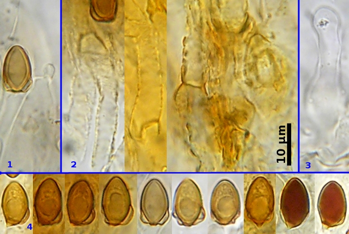 The most reliable way to identify G. cerina is with a microscope. Its most recognizable microscopic feature is the calyptra on its basidiospores. Figure 4 shows several basidiospores, the first four from the left are in profile; the next four are in face view, all mounted in 5% KOH. The two spores at right, seen in profile, were photographed in Melzer's solution to demonstrate the dark red dextrinoid reaction characteristic of most species of Galerina. Most of the spores in Figure 4 show a peculiar ballooning of the wall in the lower part. This swelling is called a calyptra and is the outer spore wall that pulls away from the spore is a very characteristic and regular way. Galerina is a fairly large genus of mushrooms with perhaps more than 200 species (3), yet no more than 20 of these species, such as G. hypnorum and G. sphagnicola, have calyptrate basidiospores. Figures 1, 2 and 3 show other features of G. cerina. Aside from showing yet another calyptrate spore, Figure 1 also shows a hypha with a clamp connection, a feature missing in some species of Galerina. The middle panel of Figure 2 also shows a hypha with a clamp connection. The main purpose of Figure 2 is to demonstrate the strongly encrusted hyphae that make up the surface of the cap. Figure 3 shows a cheilocystidium. These structures line the edges of the lamellae and are often useful for identification. Cheilocystidia of G. cerina are thin-walled and shaped somewhat like little bowling pins.