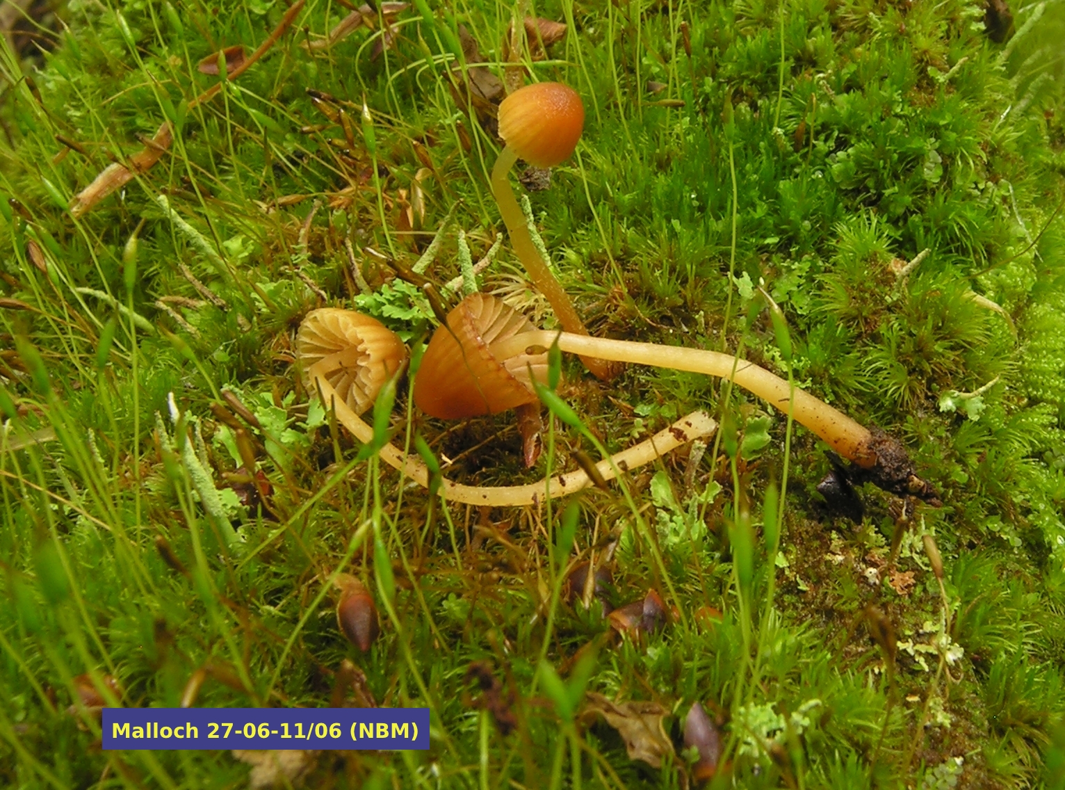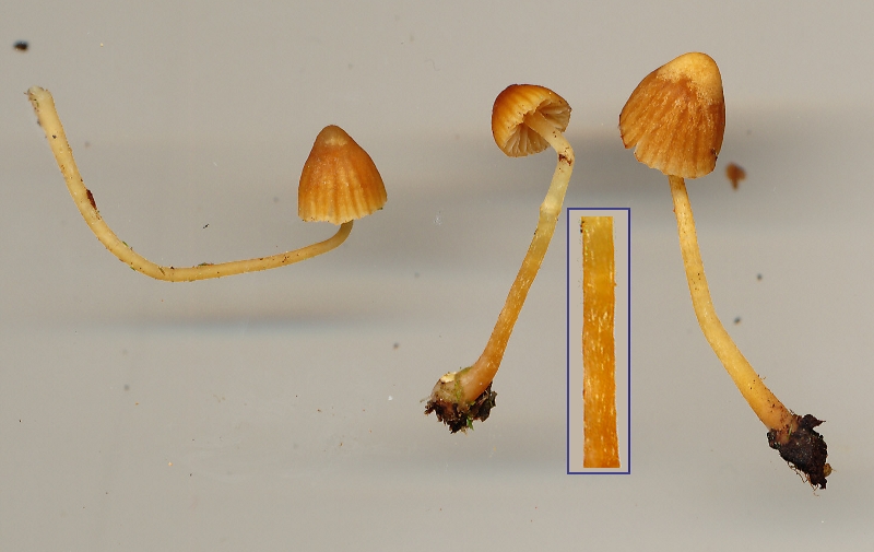 Galerina cerina is a small and easily overlooked mushroom. It is remarkably similar to several other species of Galerina, and is, in fact, only identified with certainty using a microscope. The ones shown on this and the main page were barely 35 mm tall and were found growing among mosses on an old sugar maple log in the Caledonia Gorge Protected Natural Area near Riverside Albert, New Brunswick. A comparison of the two illustrations is interesting: the three mushrooms were first photographed in the field and were then, several hours later, copied on a flatbed scanner. Note that the stipes are less transluscent in the older specimens and the one in the middle shows some white threads left over from the universal veil, seen better in the magnified insert. The caps have faded at the centre, a condition mycologists describe as hygrophanous.