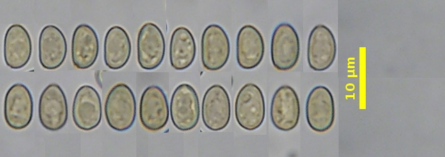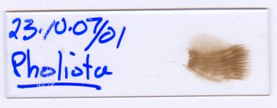 Members of the genus Pholiota belong to the family Strophariaceae. All species in this family have yellow-brown to purple brown basidiospres, seen clearly here as a "spore print" on the glass microscope slide. To the right of the slide is a group of these basidiospores viewed at high magnification. As you can see, they have quite smooth walls.