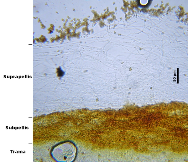 Pholiota spumosa, in common with many of species in this genus, may have caps that are slimy or viscid in wet weather. This slime is a gelatinous substance produced by the hyphae in the uppermost layers of the cap. The picture at right is of a cross section made through the flesh of a cap. It is made up of three layers, the suprapellis, the subpellis and the trama. The suprapellis is the part that becomes gelatinous and is entirely responsible for the slime. The subpellis is a solid layer below the suprapellis that serves as a sort of surface for the slime. The trama is merely the "flesh" of the cap and accounts for its thickness all the way through to the gills. The term "pellis", used with "supra-" and "sub-" in this example, simply refers to a skin-like tissue. When the pellis is on a cap mycologists call it the pileipellis; when it refers to the skin of the stipe it is called the stipitipellis