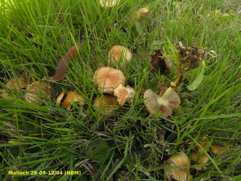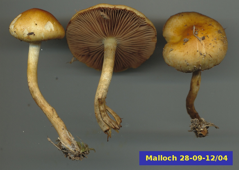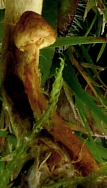 Pholiota spumosa is commonly found on Canadian lawns in the fall. Although it appears to arise from soil it actually grows on buried wood and roots. The picture on the title page shows its typical clustered growth habit among the grasses. In this picture, notice the slug that had been feasting on the caps of the mushroom, especially the thoroughly pruned one at centre. The pictures above show some fruiting bodies from the same location. The small one at right was still very young and retained the partial veil covering the gills. At maturity this veil material has mostly disappeared and may leave only a subtle trace of its presence on the upper part of the stipe.