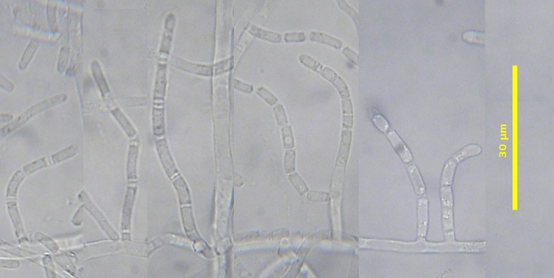 The picture at left doesn't look like a mushroom at all, but this is what you get if you try to grow P. spumosa in a Petri dish. The hyphae is this culture produced short branches, each of which became divided into individual spores or conidia. Unlike the production of basidiospores, conidia are the result of asexual reproduction. When they find a suitable place to grow they germinate to form a clone of the parent. In common with many other mushrooms, conidia of P. spumosa retract their contents toward the centre, leaving a small empty area between the next conidium. The empty area is separated by a septum so that the area between conidia often appears to have three walls. This type of cell separation is termed rhexolytic by mycologists. When we see it we are almost certain that were are looking at a basidiomycete. It is not always easy to see, but some hyphae, such as those at the left side of the picture, will oftem show it very clearly.