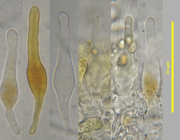 Another feature of the Strophariaceae found in most species of Pholiota is the presence of chrysocystidia, sterile microscopic structures occurring on the sides and edges of the gills. These cells are produced among the basidia on the gills. Their function is still not known, although many mycologists suspect they play some role in limiting the feeding of insects on the tissues of the mushroom. Chrysocystidia are characterized by their contents, which are golden yellow under the microscope. The ones in the picture here were stained in Melzer's solution and appear orange. As you can see, not all of them have taken up the orange stain. Strictly speaking, chrysocystidia should have a distinct body within them showing the yellow colour, but in fact many only show a more generalized reaction like the ones here.