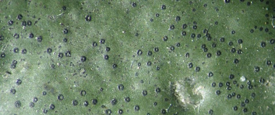 , grows lower down in the tidal zone and may remain covered with water most of the time. In the picture at right the perithecia of V. mucosa are indicated by the black doughnut-shaped stromata scattered over the green thallus. The perithecia themselves are below the surface and the tops of their necks are covered by the black stromatic tissue with a hole in the centre leading into the ostiole. This picture was taken of material collected in late February when the asci were immature and the area above the ostiole still contained algae. Although many species of Verrucaria are aquatic, they must release their ascospores when they are exposed to the air. If a rock with V. mucosa is collected from the water and then suspended over a glass slide it will shoot its ascospores out onto it. However it will not shoot a second group of ascospores until it has been returned to the water for a few hours.The section on algal mutualisms discusses these lichens and their diverse habitats further. It also deals with the very interesting case of Mycophycias ascophylli, a member of the Verrucariales that lives in a mutualistic association with the brown seaweed Ascophyllum nodosum. Mycophycias ascophylli has all the attributes of other Verrucariales yet it does not form a conventional lichen thallus.