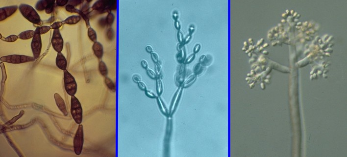 Most air-dispersed hyphomycetes do not have forcibly discharged conidia. Instead they have very loosely attached conidia that can be disloged by the slightest air current. Fungi of this type often have long hyphae that extend the conidia well away from the substrate, thus escaping the dead air (boundry layer) that surrounds them. At left are three species that occur commonly in samples of airbore fungi. These are, left to right, Alternaria alternata, Cladosporium cladosporioides and Botrytis cinerea. These three species are unrelated to one another yet often share the same habitats and have similar modes of dispersal.
